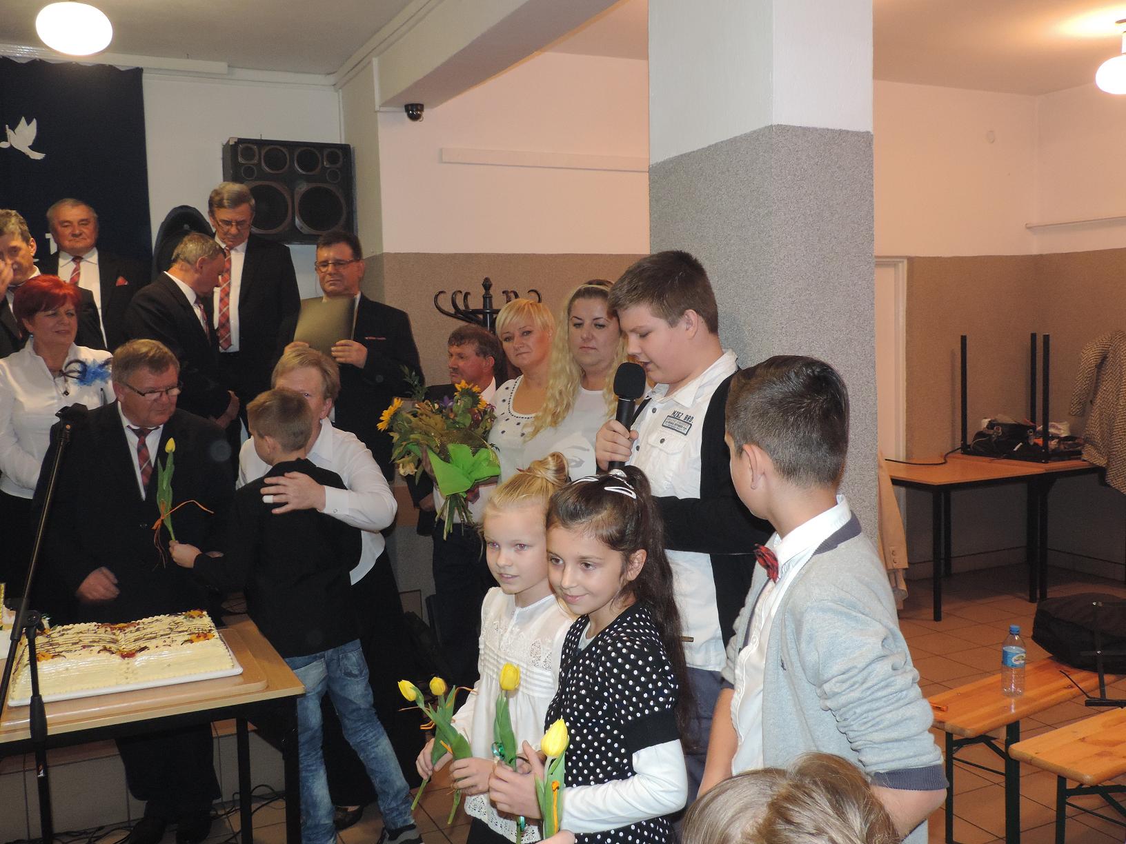 Po występie pierwsze życzenia - długich lat działalności artystycznej i nieustannej radości ze śpiewania - złożyła Pani Bożena Kordek - Wójt Gminy Małkinia Górna. Wręczając plakietkę z gratulacjami Pan Rafał Kowalczyk - Wójt Gminy Wąsewo - w bardzo ciepłych słowach nakreślił historię kontaktów z prowadzącym chór p. Chaberskim, a także wysoko ocenił udział chóru w uroczystościach w sanktuarium w Wąsewie. Kolejne życzenia złożyli uczniowie i Rada Rodziców z Zespołu Szkół Nr 2 w Małkini Górnej, Pan Andrzej Sadowski - Dyrektor małkińskiego GOKiS oraz chór "Małkinianka". Słuchacze podziękowali artystom gromkimi brawami i wspólnie odśpiewanym Sto lat.