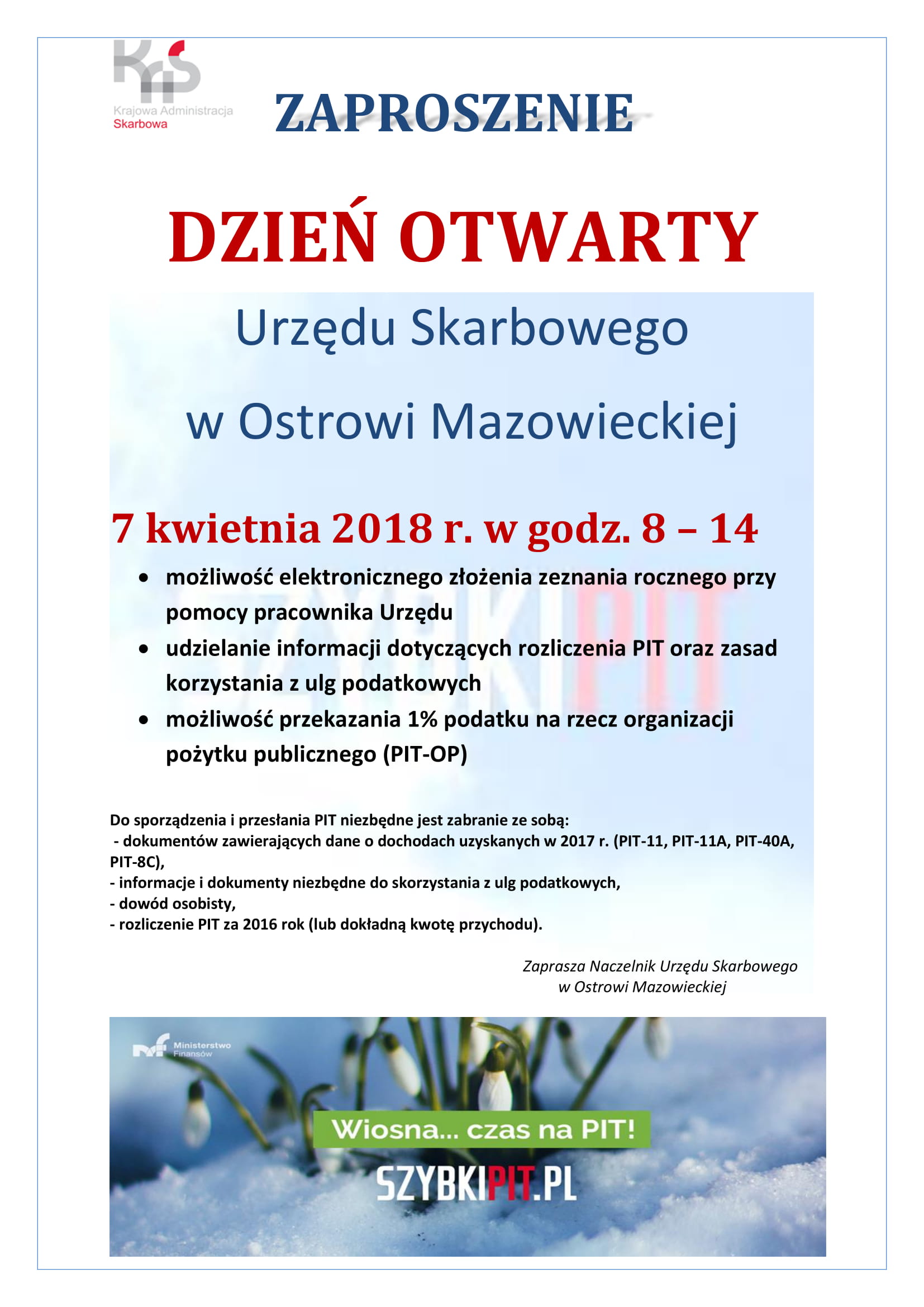 Urząd Skarbowy w Ostrowi Mazowieckiej zaprasza na dzień otwartyOpublikowano: czwartek, 29 marzec 2018 16:01 | Drukuj | E-mail | Odsłony: 1978TweetShare 0 commentsFacebook Social Comments Poprzedni artykuł Następny artykuł